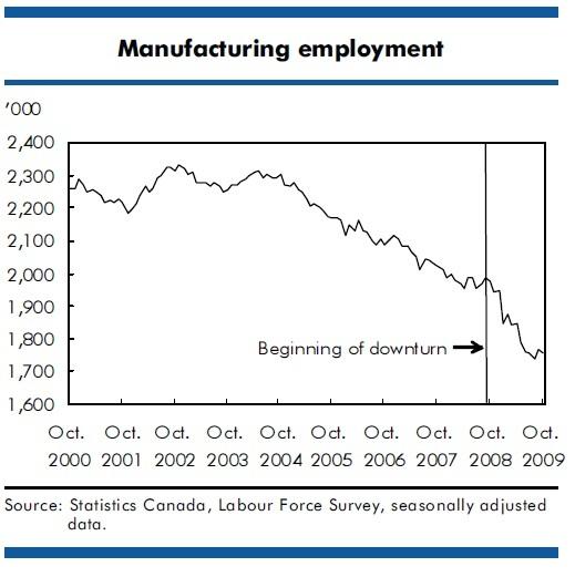 According to this chart, a feature of the 2008-2009 recession was the impact on the industrial sector which affected particularly the manufacturing, construction, resource, transportation and warehousing industries. Secondary manufacturing accounted for over half of all job losses.